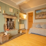 Accessed through a doorway inserted into the former gable wall of the original cottage, this spacious living area benefits from three new hardwood windows (Meranti, Vienna-style glazing bars) and a fully glazed patio door. It offers beautiful views over the lower part of the property, the salmon river and the surrounding mountains.