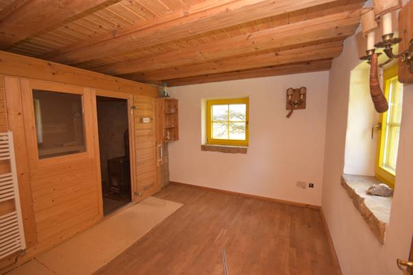 A rustic masonry fireplace with a natural stone seating area, along with a large natural stone feature integrated into the corner of the room, creates a warm and inviting atmosphere. The fireplace, fitted with a large closable glass door, is capable of heating the room efficiently despite its size. The room is also connected to the central heating system.