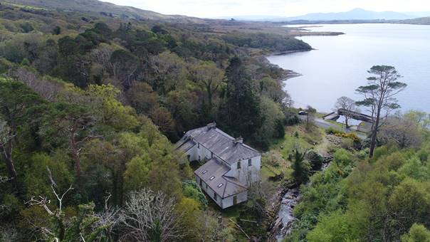 The forest borders the east and north sides of the property and is one the last locations of surviving ancient Irish oak trees in the country. A stream runs all along the west side and on the south side only a road separates the property from Lough Feeagh which is a 5km lake that is renowned for salmon fishing. The lake is literally a stones throw from the front garden.